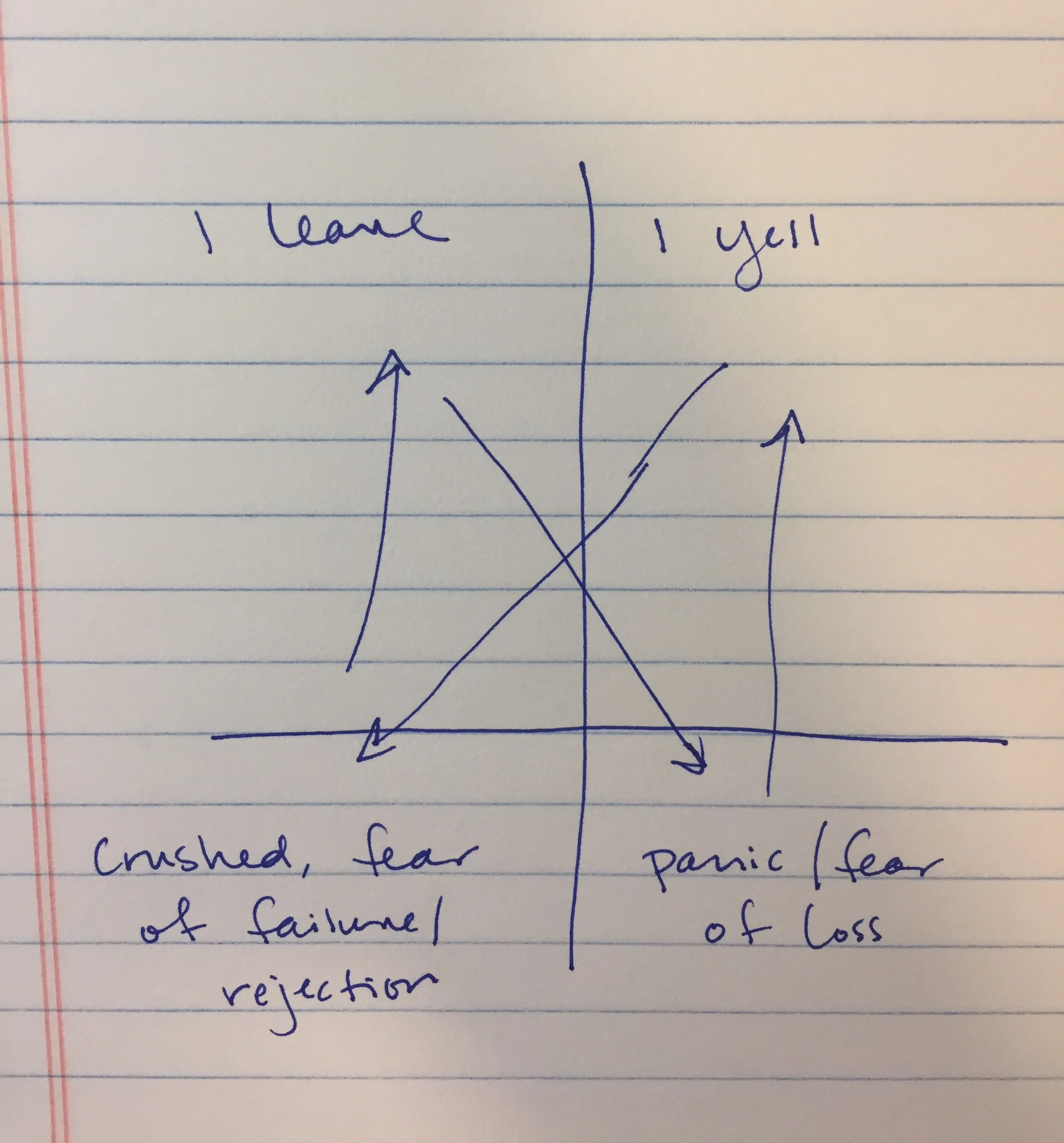 Jennifer and Lillian broke down the cycle in a way that just clicked it into place for me in a way I hadn’t thought of before. First, Jennifer showed us how when taking notes in session, she divides her page like this (see image below), and in the upper quadrants she puts the behaviors, thoughts, and secondary emotions, and in the bottom she puts the primary emotions/attachment fears. Just this simplification alone helped me get a little clearer, since in session it’s going too fast for me to pause and find where I’ve got my “perception” line so my paper looks like a mess at the end of session. Also, it helps me to write in the client’s names depending on if they are in the left or right chair in front of me, instead of as the pursuer/withdrawer.